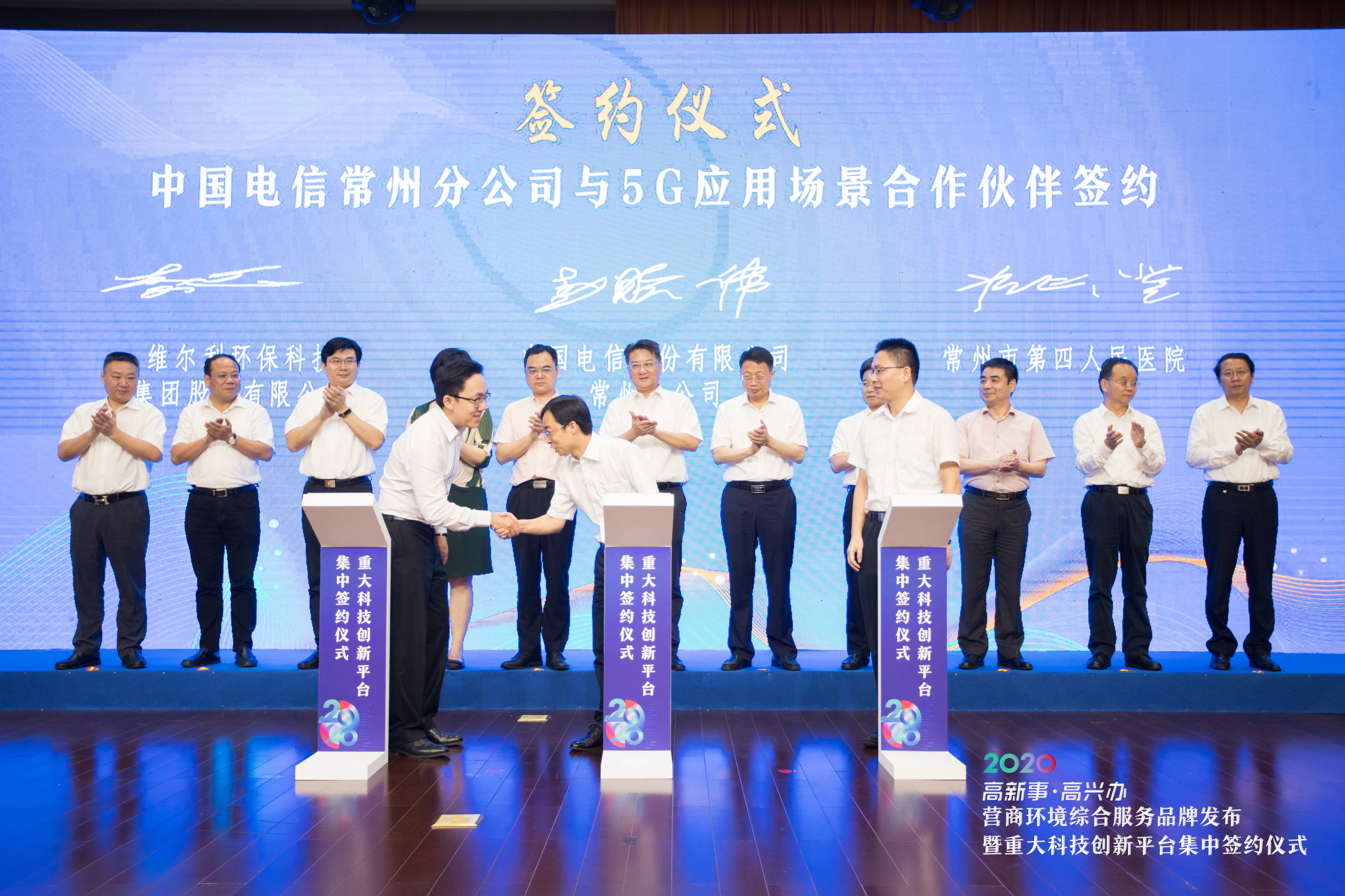 7月18日上午,在常州国家高新区举办的营商环境综合服务品牌发布暨重大科技创新平台集中签约仪式上,维尔利环保科技集团股份有限公司(以下简称:维尔利集团)与中国电信股份有限公司常州分公司(以下简称:常州电信)签订了企业5G+工业互联网项目建设及应用战略合作协议。