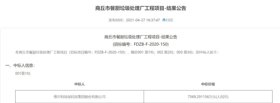 近期,维尔利环保科技集团股份有限公司参与了商丘市餐厨垃圾处理厂工程项目第一标段的投标,成为该项目第一标段中标人。