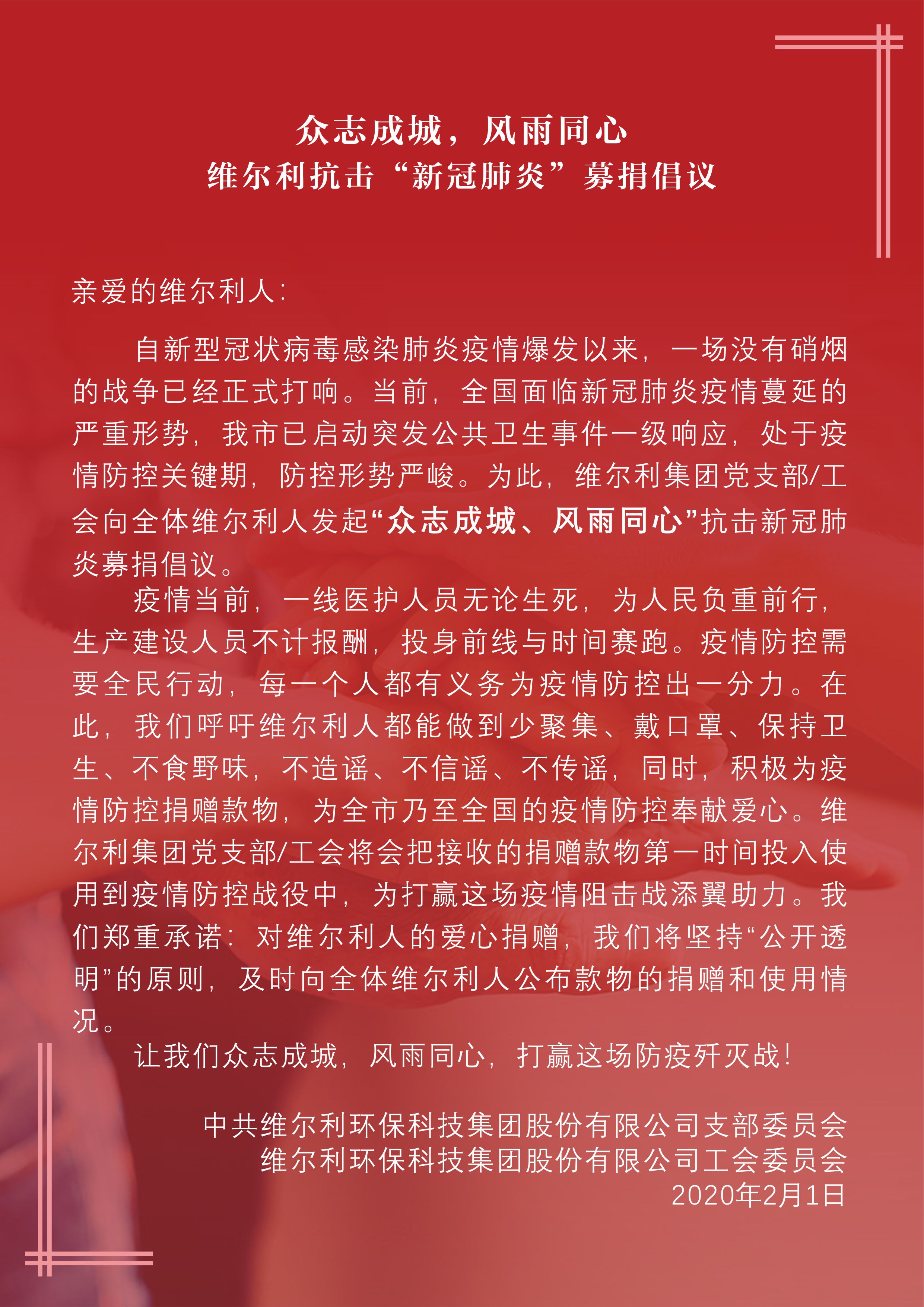 2月1日晚,中共维尔利环保科技集团股份有限公司党支部及维尔利环保科技集团股份有限公司工会委员会第一时间响应,向全体维尔利人发出“众志成城,风雨同心”—维尔利集团抗击新冠肺炎募捐倡议书。倡议发出后,维尔利人踊跃参与,积极奉献爱心。截止到2月5日活动结束为止,共收到维尔利人捐款共计358908元。
