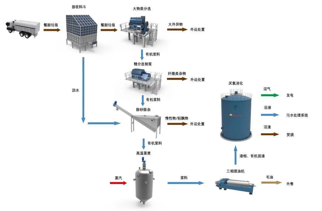 维尔利餐厨垃圾处理方法为预处理+厌氧消化。收运的餐厨垃圾采用“接收、分选、除砂除杂、浆料加热、提油”预处理后,形成的剩余有机液相进入厌氧系统。厌氧系统发酵产生沼气,经过净化处理后,可直接进行资源化利用,如用于锅炉、发电或提纯。厌氧系统产生的沼液,需要经过污水处理后,方可达标排放。厌氧系统的沼渣、污水处理系统的剩余污泥经过脱水处理后,外运无害化处置。