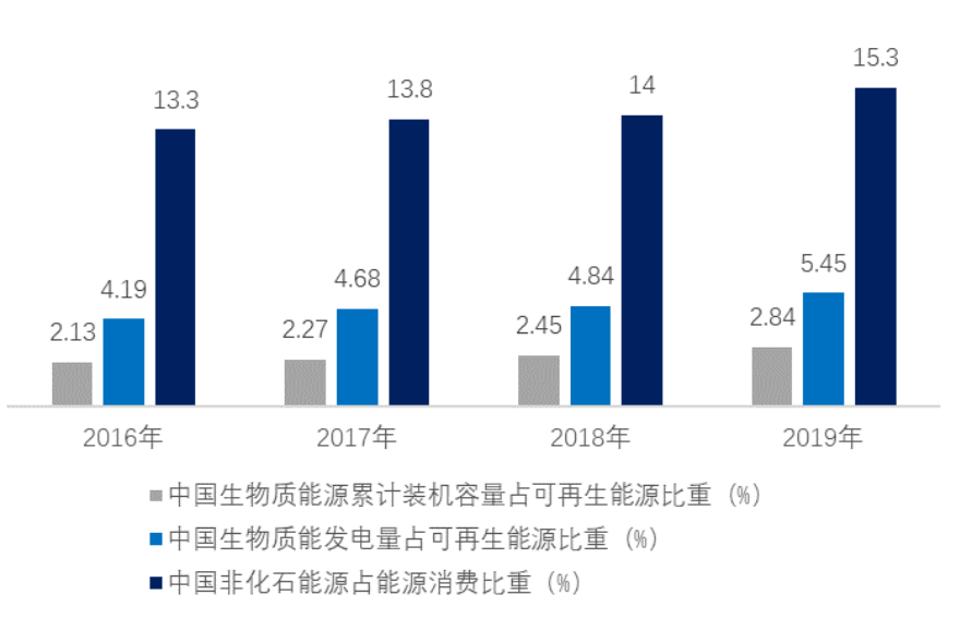从生物质能地位变化情况来看,近年来生物质能发电持续快速增长,生物质能装机和发电量占可再生能源的比重不断上升。具体表现为:至2019年我国生物质能源装机容量和发电量占可再生能源的比重分别上升至2.84%和5.45%。生物质能发电的地位不断上升,生物质能发电正逐渐成为我国可再生能源利用中的新生力量。