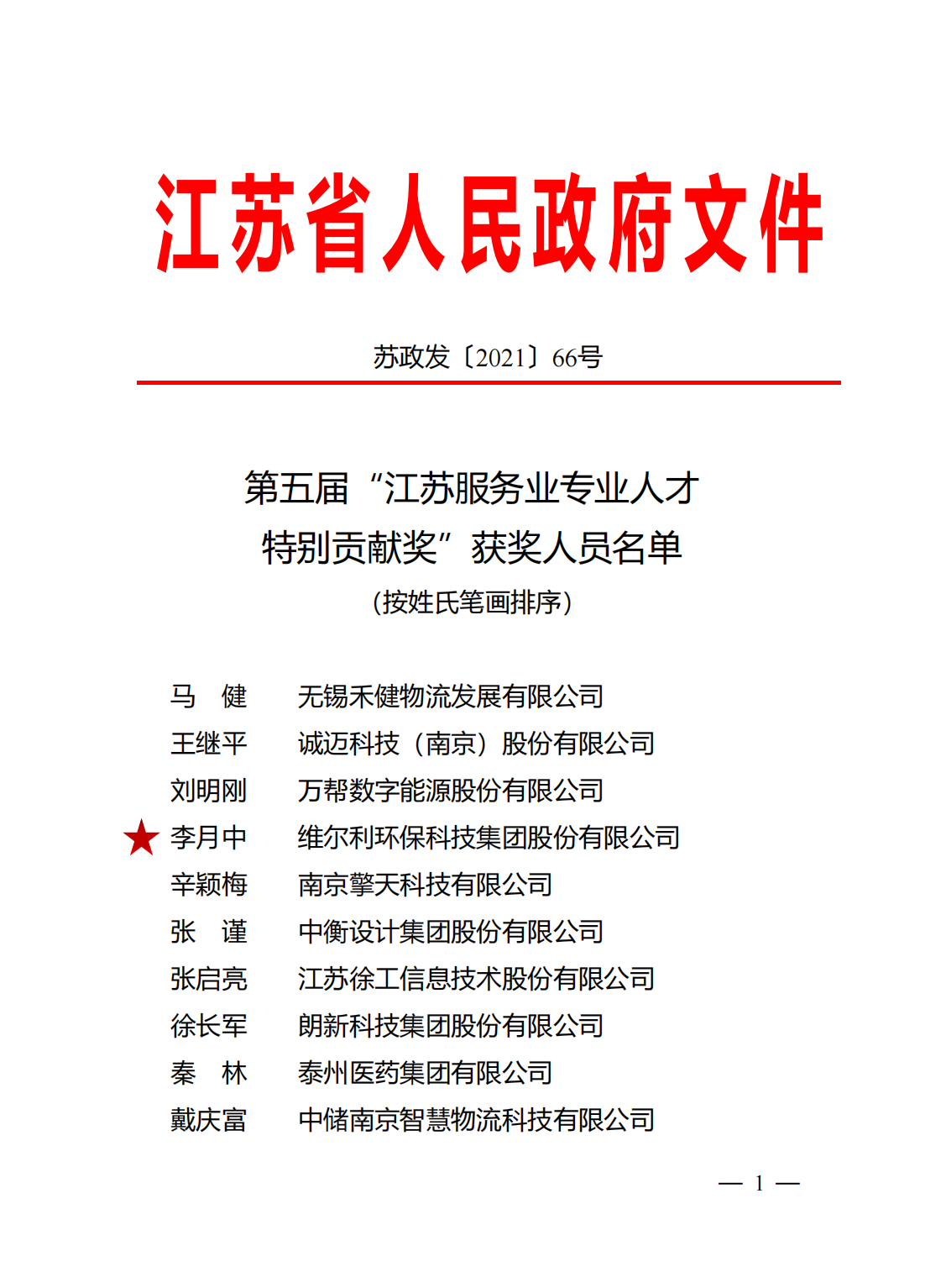 近日,江苏省人民政府发布第五届“江苏服务业专业人才特别贡献奖”获奖人员名单,本次共表彰10人,维尔利环保科技集团股份有限公司董事长李月中先生成功入选。